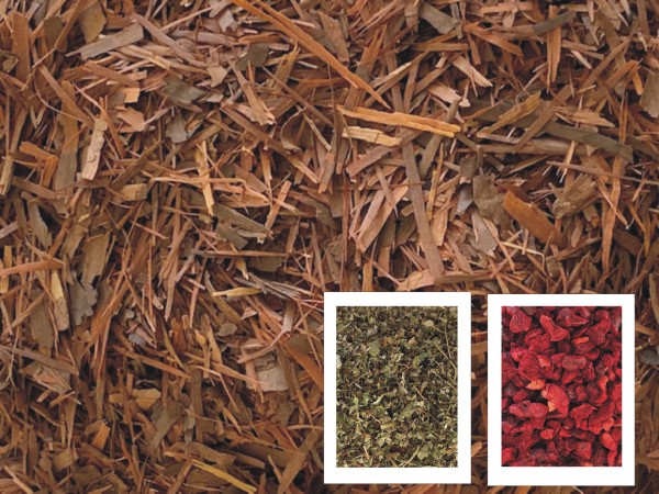 Zutaten: Lapacho, Himbeerstückchen, Himbeerblätter, Aroma.